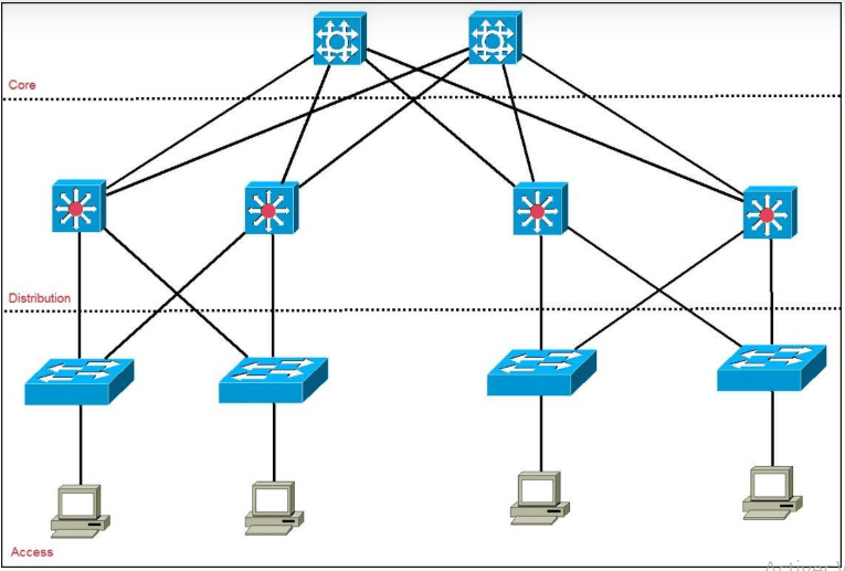 À mesure que le nombre de commutateurs de distribution augmente, il est difficile d’établir une connectivité maillée complète dans ce cas on est obligé de faire une architecture à 3 niveaux. Cela consiste à mettre en œuvre un ensemble dédié de périphériques de base(niveau coeur), de sorte que chaque commutateur de distribution soit connecter à chacun d’eux. L’architecture à 3 niveaux a implémenté les 3 couches, comme le montre la figure ci-dessous.