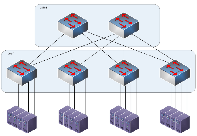 L’architecture Leaf-Spine représente une topologie de réseau de Datacenter de plus en plus populaire. Elle consiste en deux niveaux composés de commutateurs « feuilles » (Leaf) et de commutateurs « troncs » (Spine). Dans une telle topologie, chaque périphérique d’une couche se connecte à chaque périphérique d’une autre couche. Aucun lien direct n’existe entre les appareils situés sur la même couche.