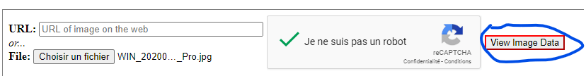 D’abord, il faut uploader le fichier en cliquant sur Choisir un fichier, puis cocher la case Je ne suis pas un robot et enfin cliquer sur View image Data :