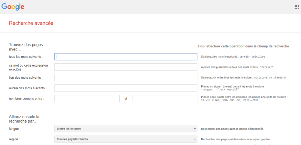 La page de recherche Google avancée : https://www.google.com/advanced_search.