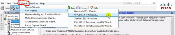 - Vous vous êtes connectés sur le ASA via ASDM, cliquez sur Wizards -> VPN Wizards -> Anyconnect VPN Wizard… :