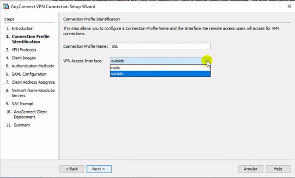 - Entrez le nom de votre VPN sur le champ Connection Profile Name, choisissez l’interface d’accès au VPN (outside) au niveau de VPN Access Interface puis cliquez sur Next :