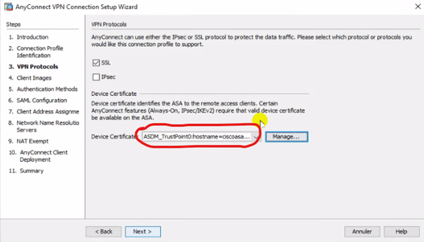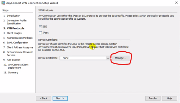 - Cochez seulement SSL et choissez un certificat, s’il y en a, au niveau de Device certificate :
