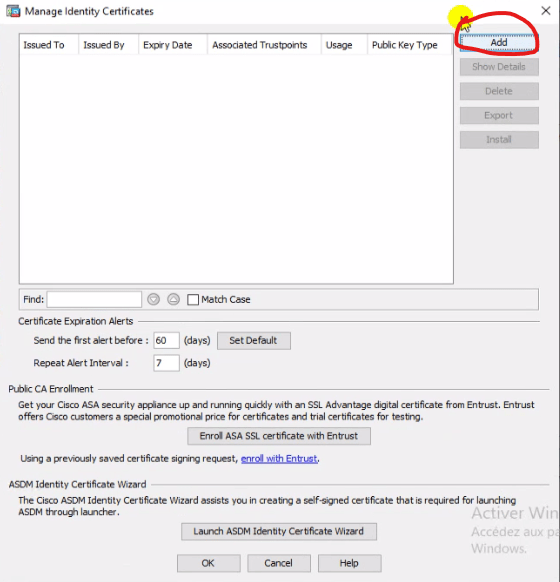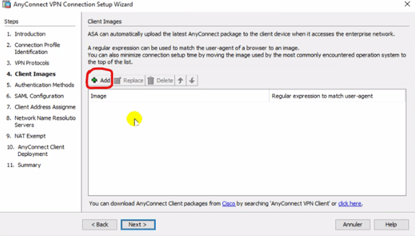 - Le client doit se connecter sur le VPN en utilisant l’outil AnyConnect qu’il va télécharger au niveau de l’ASA. La fenêtre suivante va nous permettre d’ajouter cet outil sur le VPN pour permettre son téléchargement. Cliquez sur Add :