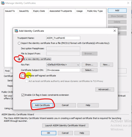 - Sélectionnez la case Add a new identity certificate, cochez ensuite la case Generate self-signed certificate et cliquez sur le bouton Add certificate pour l’ajouter :
