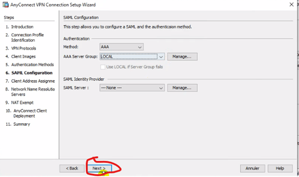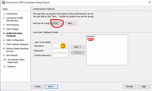 - Assurez-vous que LOCAL soit choisi au niveau de AAA Server Group et notez que l’utilisateur que nous avions créé est présent. Cliquez sur Next :