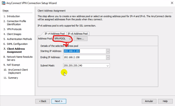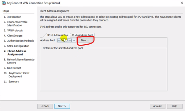 - Maintenant, il faut créer la plage d’adresse, que l’ASA va utiliser pour attribuer des adresses IP aux clients VPN, en cliquant sur New :