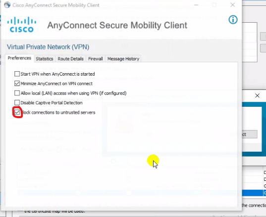 - Décochez la case Block connections to untrusted servers et fermez la fenêtre :