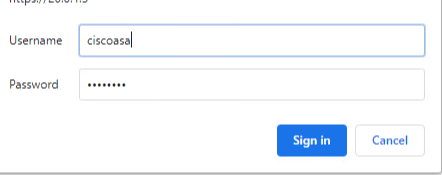 - Pour le téléchargement de l’ASDM, il est nécessaire d’entrer le username/password déjà créé (ici ciscoasa/ciscoasa) :