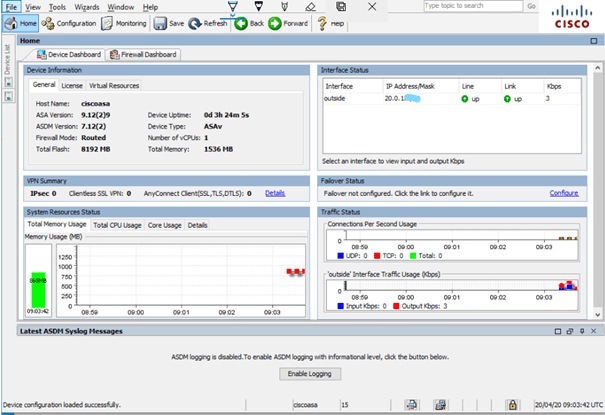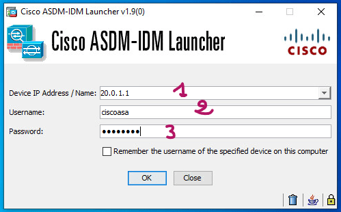 ciscoasa(config)#interface GigabitEthernet0/1 ciscoasa(config-if)#ip address 20.0.1.1 255.255.255.0 ciscoasa(config-if)#nameif outside ciscoasa(config-if)#security-level 0